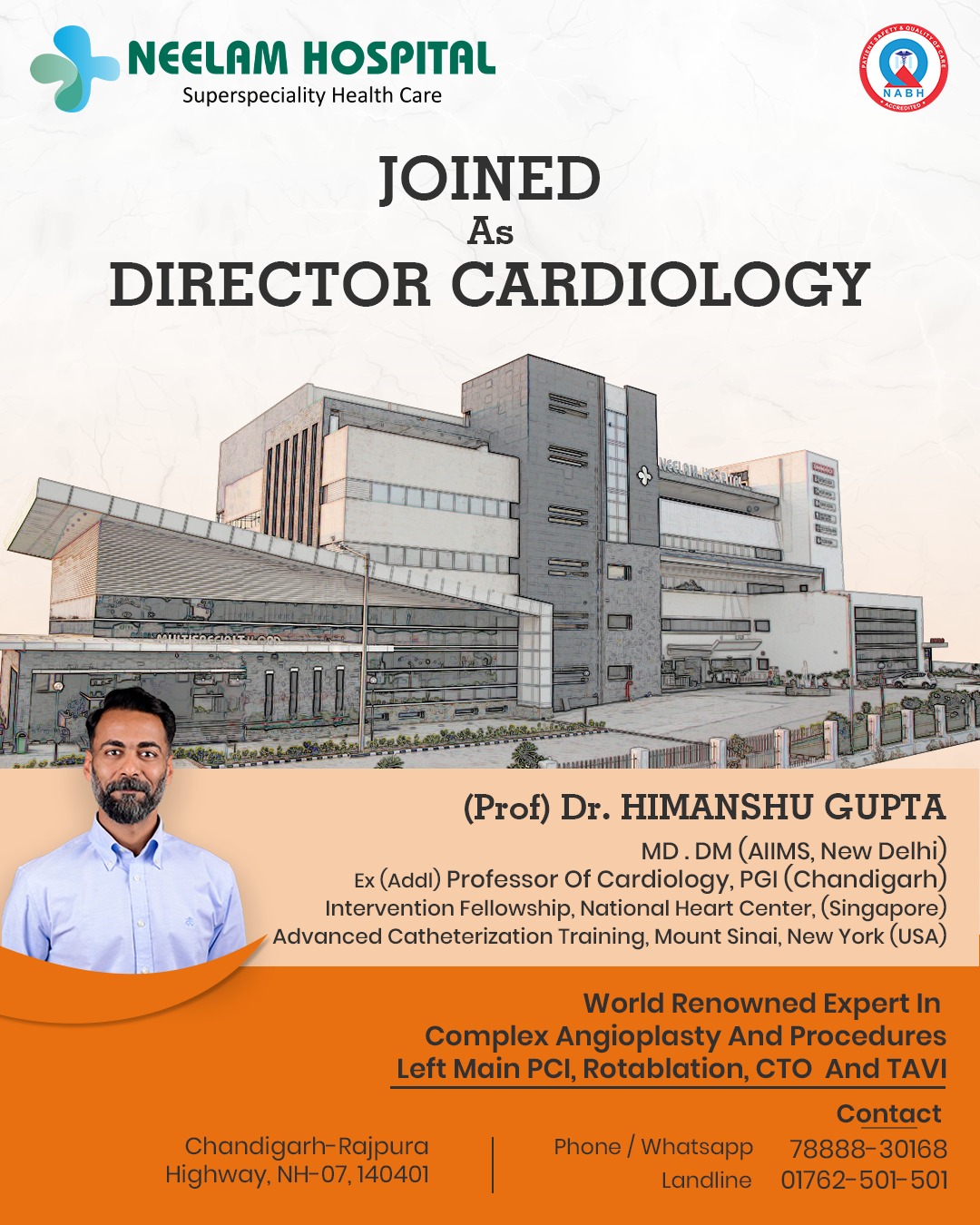 Today, Neelam Hospital is the best multispeciality hospital in Punjab, with state-of-the-art infrastructure and 150 beds and equipment to conduct all the specialists.